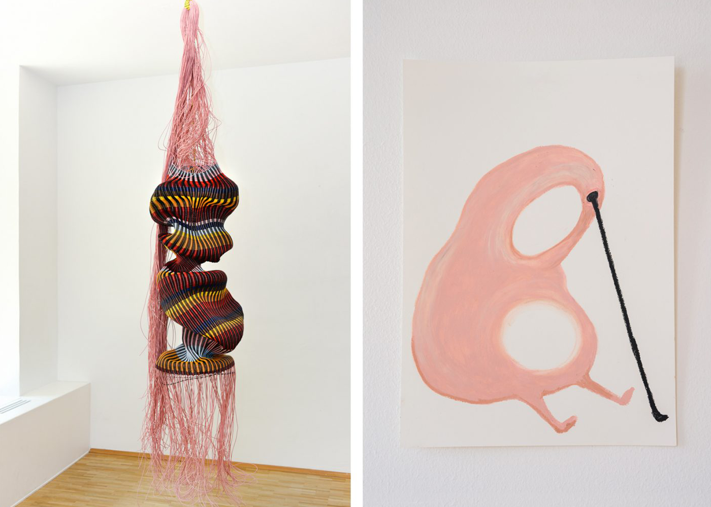Die Ausstellung erkundet organische Formen, Körperlichkeit und ihre Auflösung in vielfältigen Zuständen. Hängend, stehend, liegend – beziehen sich die Arbeiten aufeinander und stehen in einem dynamischen räumlichen Verhältnis